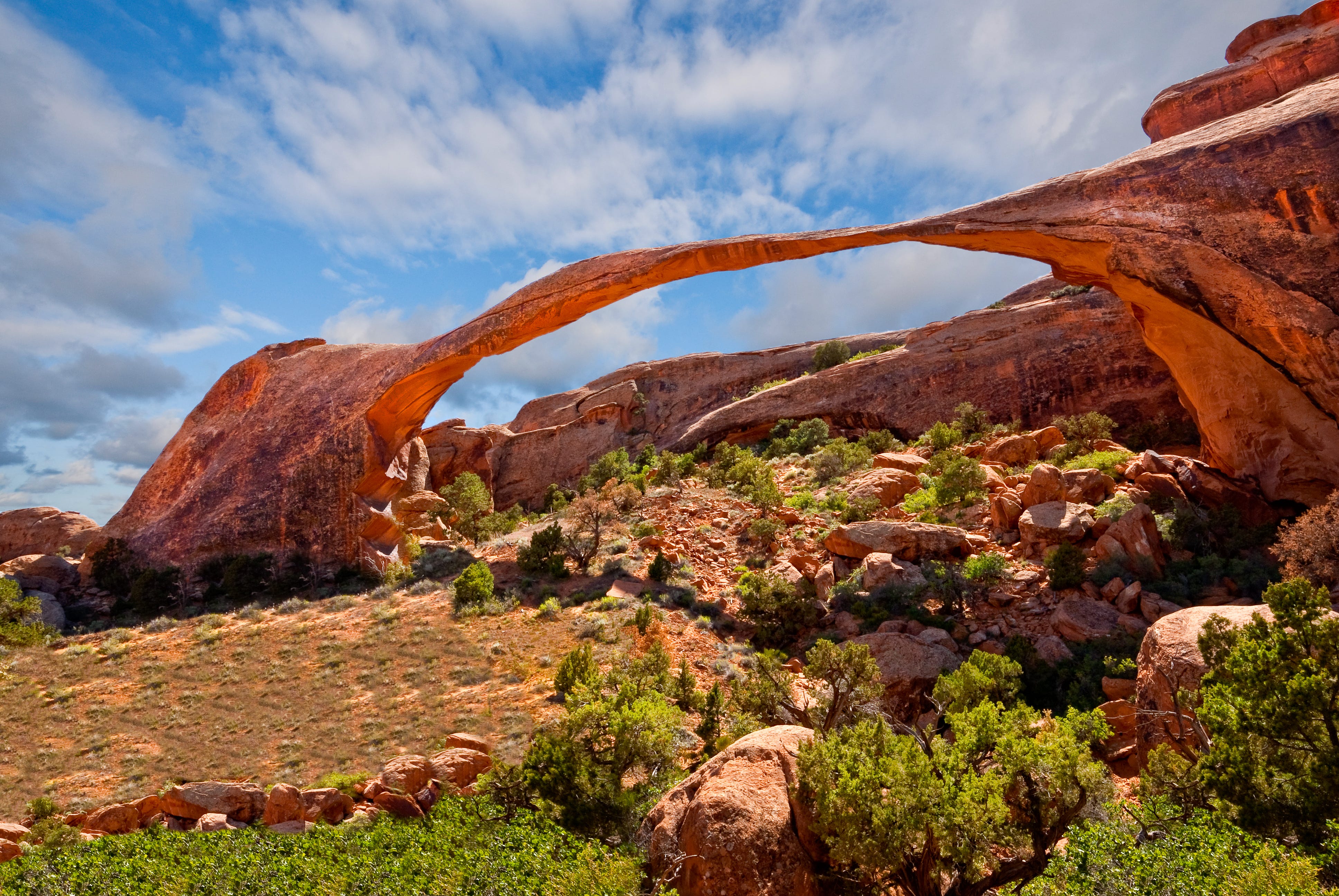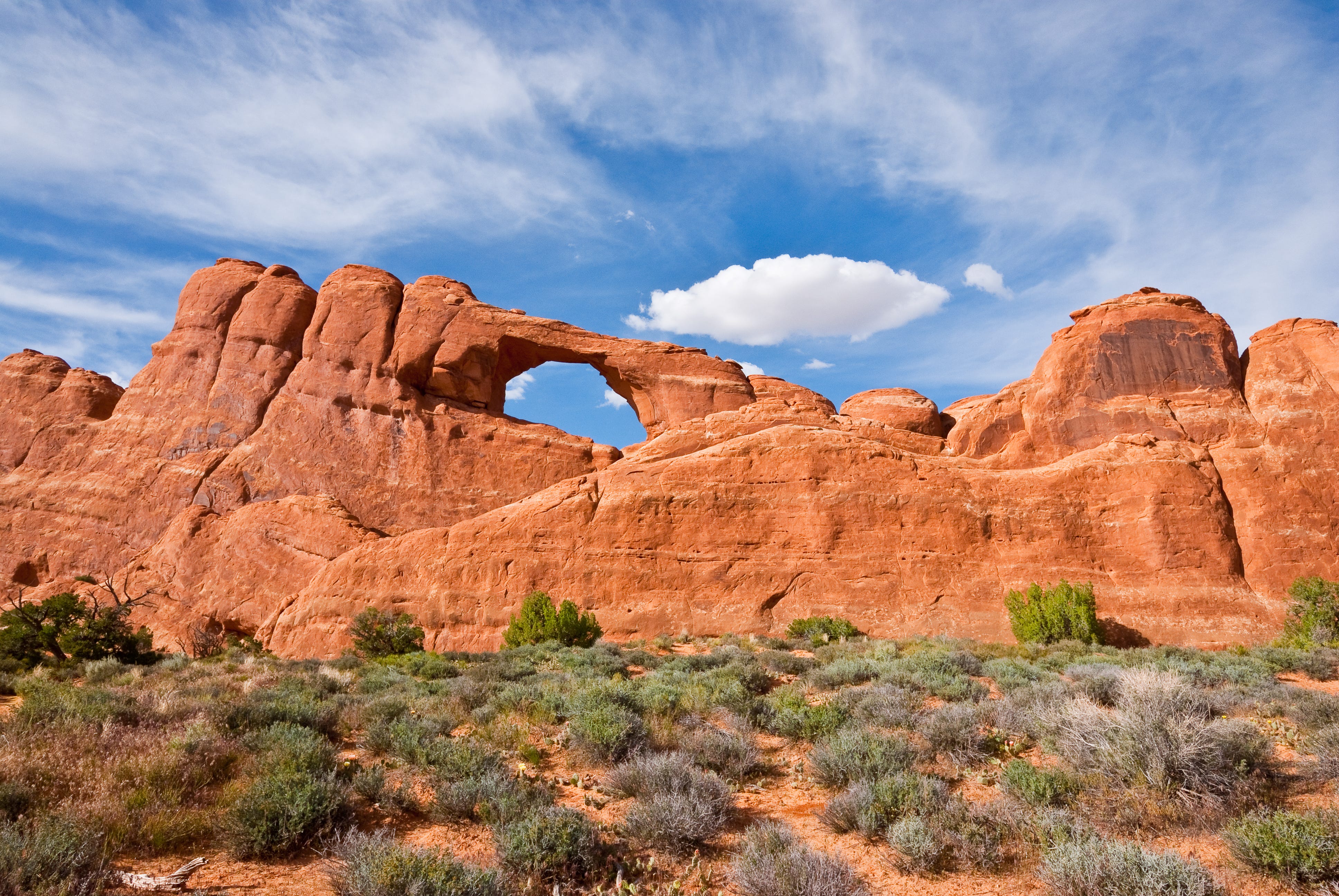Most arches evolve gradually, but change can be sudden. In 1940, a large boulder fell from Skyline Arch, dramatically enlarging its opening. The rock debris still lies at its base today — a reminder that even slow landscapes have their moments of drama.