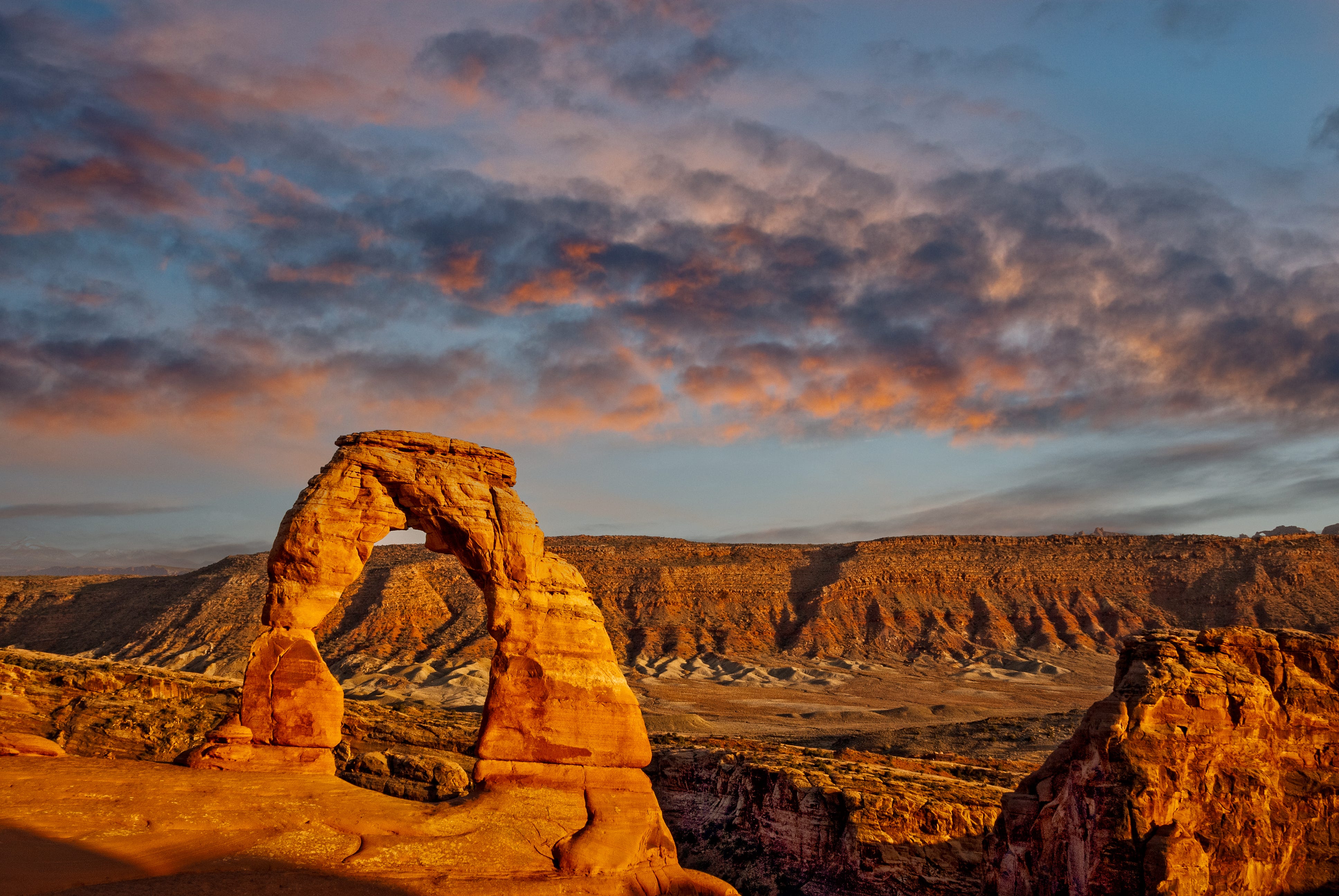 The highlight of one of my visits to Arches came in the evening. I set out on the Delicate Arch Trail late in the day, climbing across slickrock as the light softened. By the time I reached the final rise, the arch stood glowing before me, framed against a sky deepening with color.