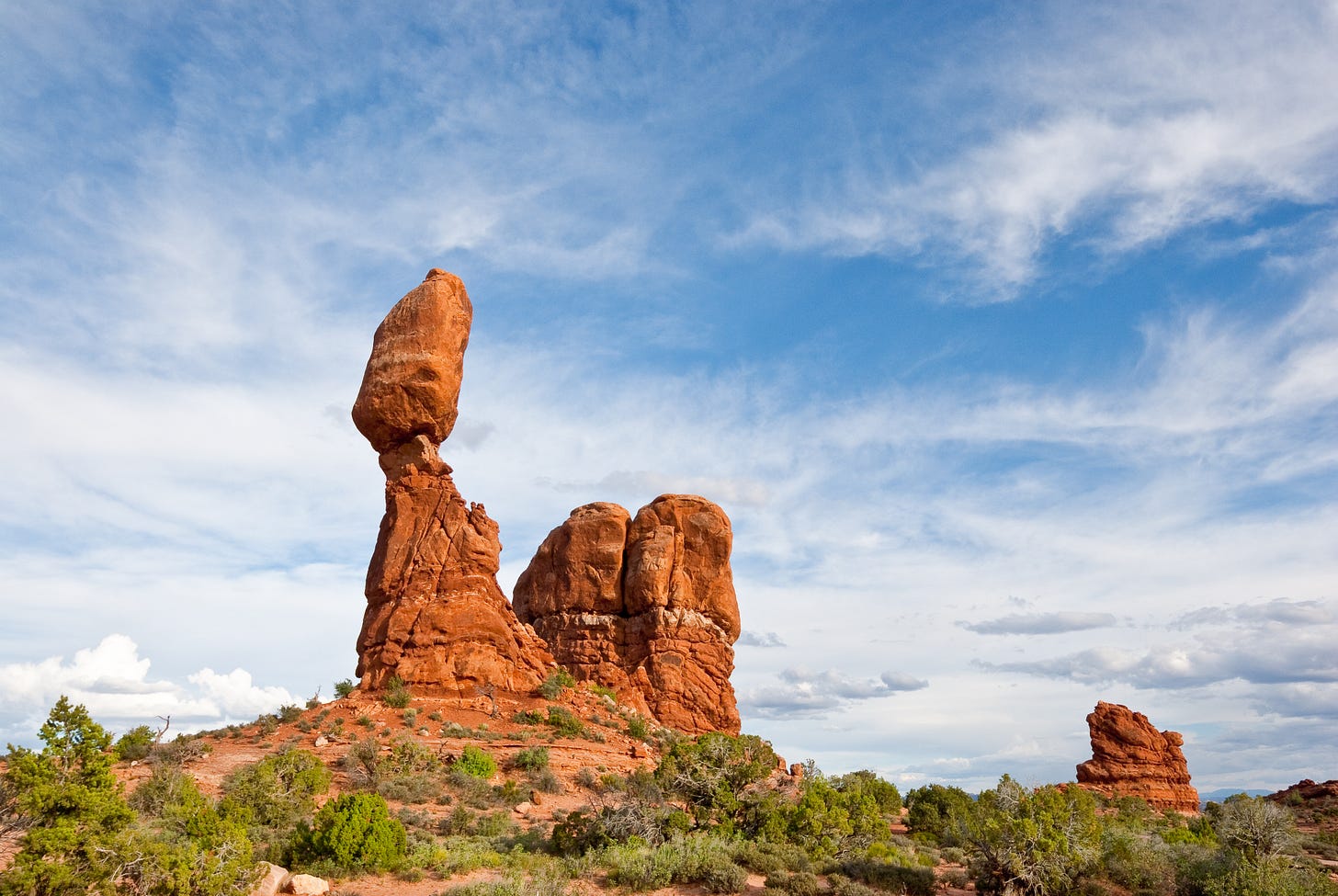 Balanced Rock towers 128 feet, its 3,500-ton sandstone cap perched improbably on softer mudstone. One day, erosion and gravity will bring it down — but for now, it stands as one of the park’s most photographed features.