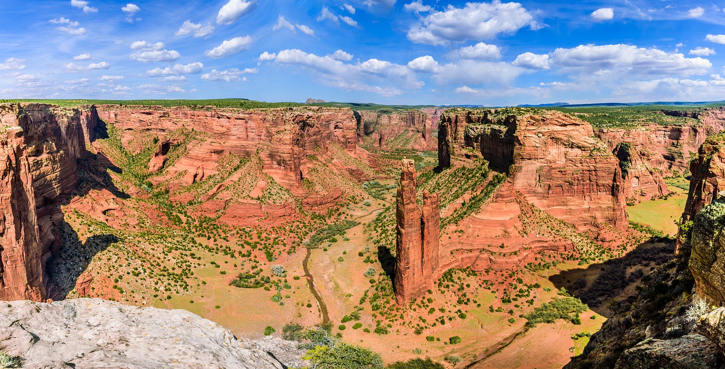 Standing on the rim of Canyon de Chelly, the view feels unanchored to any single moment in time. Red sandstone cliffs plunge away, while cottonwoods trace Chinle Creek across the canyon floor. Light and shadow creep slowly along walls shaped long ago. The quiet feels ancient, formed by centuries rather than moments.