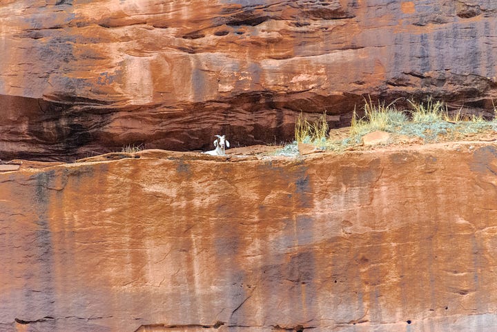 Wildlife encounters were rare but memorable. High on a ledge, what I first took to be a desert bighorn sheep turned out to be a domestic goat, somehow at ease in a place that seemed impossible to reach. Along the creek, a rock squirrel darted between bare shrubs and boulders, pausing just long enough to make eye contact before disappearing again. Moments like these blurred the line between wild and domestic, reinforcing the sense that life here adapts rather than dominates.