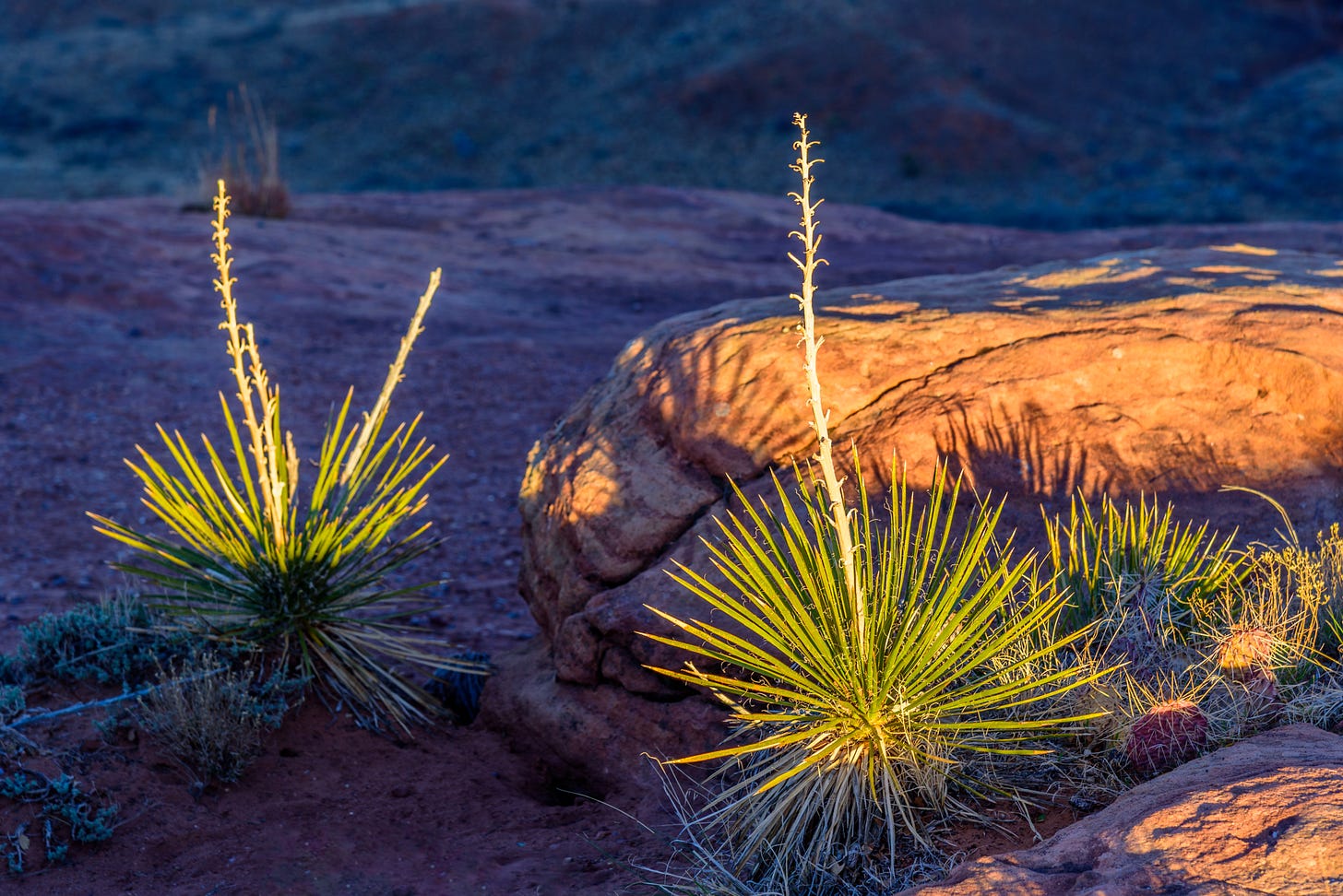 Catching that evening light were stands of narrowleaf yucca, their slender leaves edged with curling white fibers. For centuries, Native peoples have relied on yucca for everyday needs, using its leaves for weaving baskets, sandals, and rope, and its roots for making natural soap. Seen glowing against the darkening rock, the plants felt inseparable from the long relationship between people and this landscape.