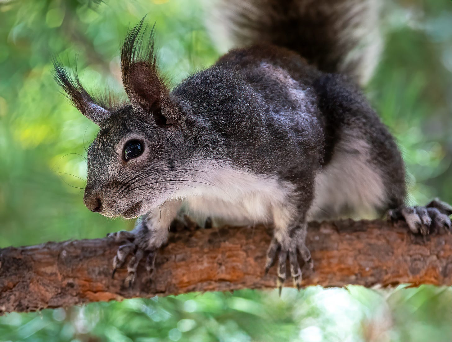 Abert’s squirrels are identified by their dark gray back with a reddish-brown patch on top, white underbelly and large bushy tail. The big tufted ears are the most distinctive feature. The ear tufts are longer in the winter and may disappear altogether in the summer. Abert's squirrels have strong rear paws and hind legs which makes it well-adapted for living in trees, climbing and jumping from branch to branch. They are a non-territorial animal that may have an overlapping range with other squirrels. They do not hibernate or cache their food and can be seen foraging throughout the year.
